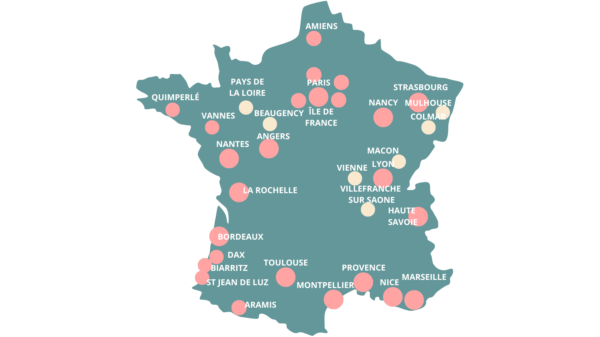 Paris, Lyon, Dax, Bordeaux, Strasbourg, La Rochelle, Nice, Saint-Jean-de-Luz, Toulouse...
